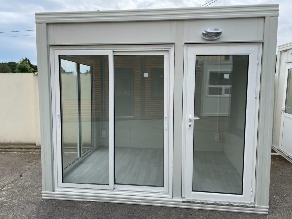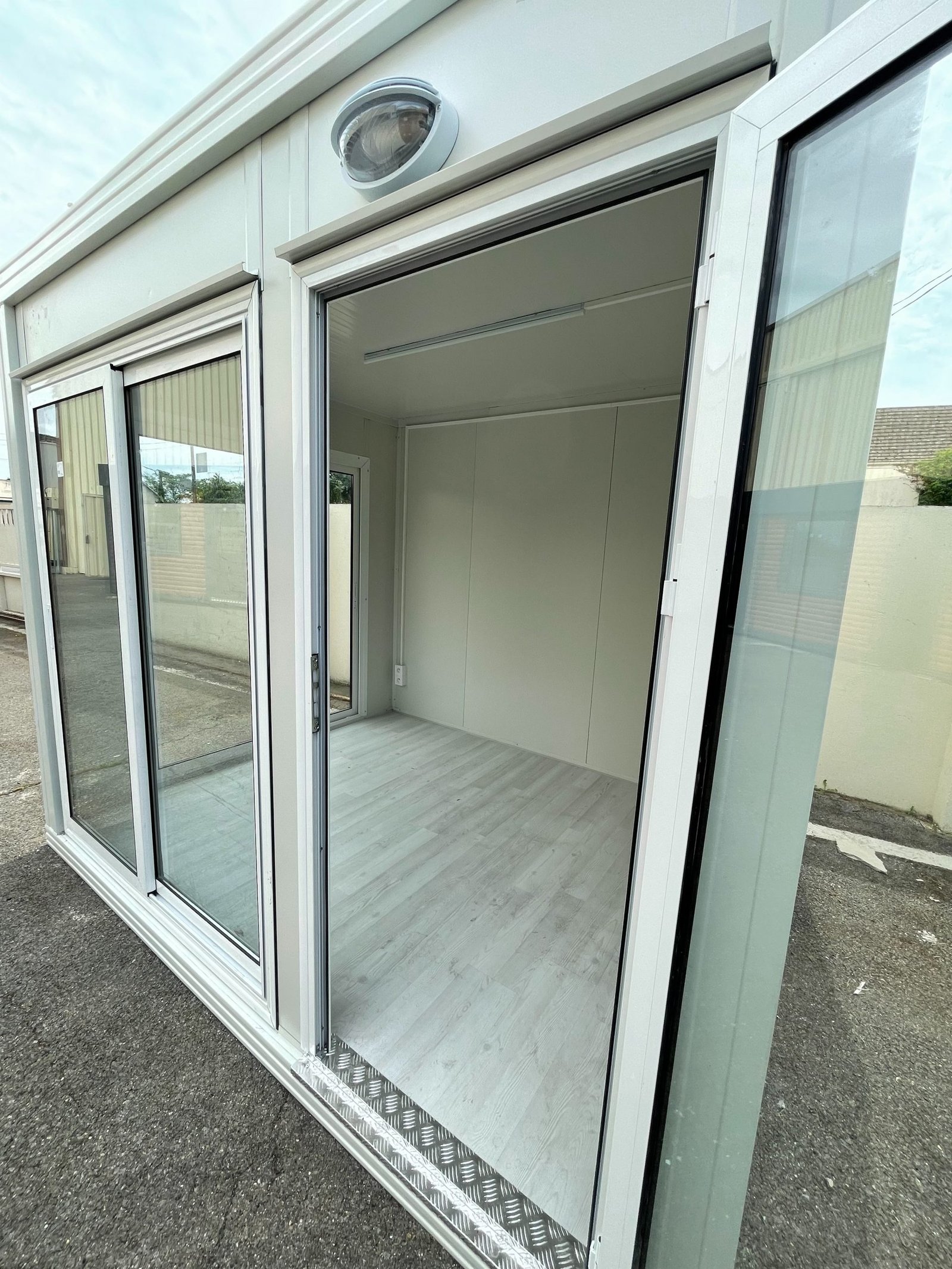 Baie vitrée en façade et latérale en aluminium, 1 porte extérieure 1 battant en aluminium, renforcé, isolé ,2 fenêtres aluminium en galandage 100mm × 220mm double vitrage .